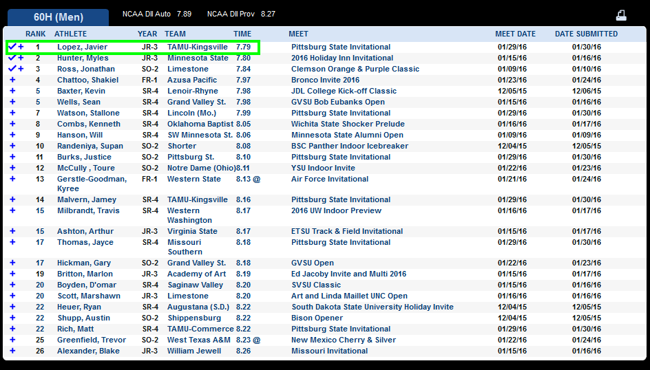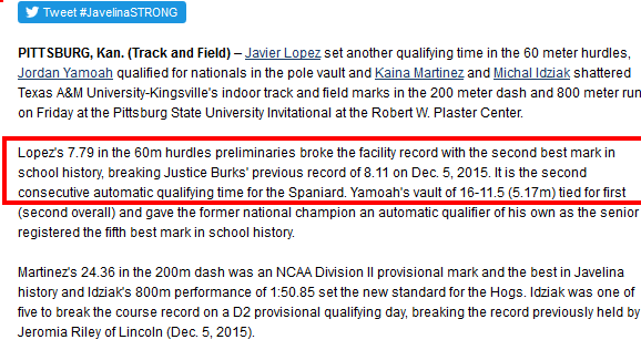 A tan solo 5 semanas del campeonato nacional universitario de los estados unidos nuestro atleta Javier López López se perfila en este su segundo año como Estudiante universitario, como claro aspirante a estar en el pódium de unas de las competiciones atléticas de más renombre y nivel deportivo en cuanto al atletismo se refiere…hablamos de la NCA.